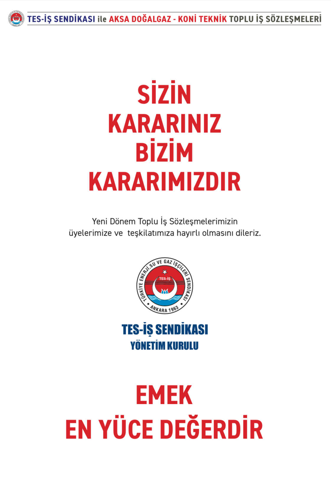 TES-İŞ Genel Merkez Yönetim Kurulu Adına